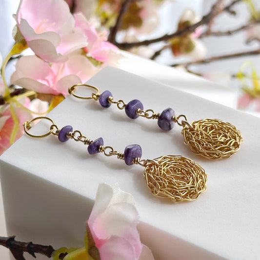 Belamora, Charoite Gemstone, Cosmic Medallion Earrings